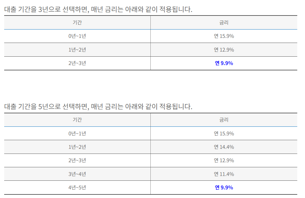 대출 금리는 연 15.9%로 매우 낮습니다. 사실, 최저신용자가 어디 가도 받을 수 없는 수준입니다. 게다가 연체없이 성실하게 상환할 경우, 1년마다 금리 인하 혜택을 받아 최종 금리는 연 9.9%가 됩니다.