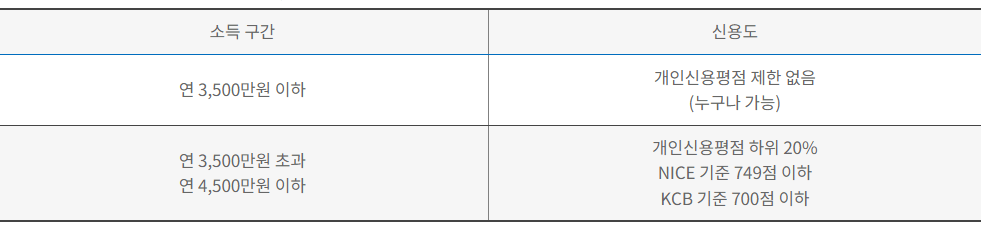 일반보증과 특례보증 상관없이, 아래의 소득 조건과 신용 조건 모두 만족해야 합니다.